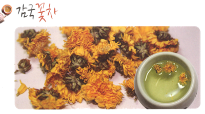 감국꽃차는 간장을 보하고 눈을 밝게 하며 머리를 좋게 합니다. 또 신경통, 두통, 기침 등에 유효하고 피부를 좋게 하는 성분이 들어 있습니다. 열감기, 몸살, 스타키드린, 열감기, 몸살, 스티키드린, 프린, 열감기, 베타인, 아데인A, 비타민 B등이 있습니다.