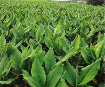 강황의 지상부는 파초와 비슷한 형태로 초장이 90~150cm 정도이고, 뿌리는 생강을 닮은 뿌리줄기와 덩이뿌리로 구분되어 있습니다. 잎은 크고 길이 30~90cm, 폭 10~20cm로 잎 끝은 뾰족하고 기부는 삼각형이며, 윗면은 푸른색입니다.