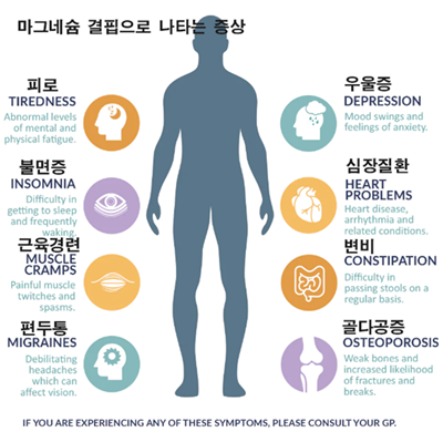 그러기에 사람의 몸의 세포 수준에서 600개 이상의 기능을 하는 작은 미네랄 영양소이지만 이 마그네슘은 너무 많아도 문제가 있고 너무 적어 결핍현상이 되면 다양한 증상들이 발생합니다.