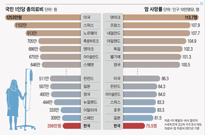 이때 암 치료비는 국가와 개인이 부담하는 비용을 모두 합친 것입니다. 비율로 따져 2위는 일본(7.5%)이고, 가장 낮은 나라는 스웨덴(3.7%)였습니다.