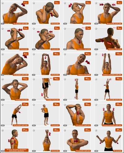 한 세트의 운동은 40초 동안 지속됩니다. 매일 이 운동들을 한다면 경직된 목은 편안해 질 것이고 목이 부드럽게 느껴 질 것입니다.