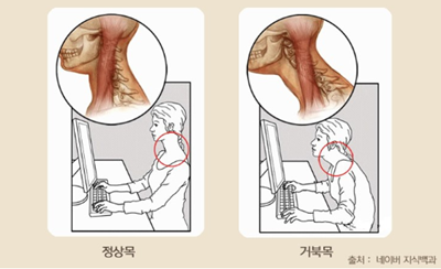 이런 지속적인 부담이 목디스크와 어깨의 통증, 두통 등으로 인하여 우리 몸에 심각한 영향을 미칠 수가 있습니다. 사무실에서 컴퓨터를 사용할 때 목을 앞으로 길게 내밀고 보는 자세와 생활속에서 핸드폰을 내려다 보는 자세가 길어지면 거북목 증후군을 앓을 수 있습니다.