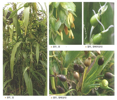 염주(Coix lacryama-job L.)중에 엽모의 유무나 자방의 형상을 기준으로 분류한 결과 엽모가 없고 자방이 구형인 것 중에서 종실이 크며 종피가 연하고 얇은 것은 율무로 분류하게 됩니다. 염주는 율무에 비해 열매가 달걀형으로 더욱 단단하고 강한광택이 있으며 이 열매를 천곡이라 하여 의이인 대신 이용했으나 현재는 사용하지 않습니다.