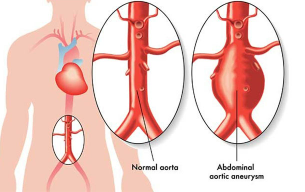 1) 복부 대동맥류(AAA) : 복부 대동맥류는 아래를 가리키는 대동맥의 "손잡이"에서 발생합니다. 대동맥은 지팡이처럼 생겼는데 지팡이로 볼 때 "손잡이" 부분을 뜻합니다. 대동맥류의 75%는 복부 대동맥에서 발생합니다.