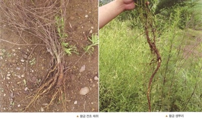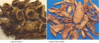 황금은 뿌리를 사용합니다. 황금의 채취는 11월 하순~12월 상순경이며 잎이 누렇게 변하면 줄기를 베어낸 다음 뿌리를 수확합니다. 수확한 뿌리는 흙을 털고 살수제척기를 이용하여 깨끗이 세척합니다.