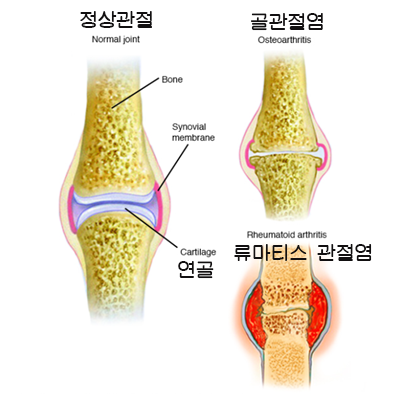 자가면역질환인 류마티스 관절염은 면역체계가 신체조직을 잘못 공격할 때 발생합니다. 골관절염의 마모, 손상과 달리 류마티스 관절염은 관절의 내벽에 영향을 미쳐 뼈의 침식과 관절기형을 초래할 수 있고 통증과 함께 부어오르기도 합니다.