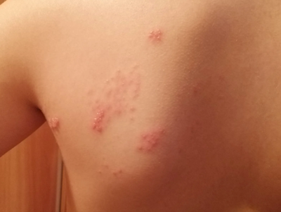 등과 엉덩이에도 대상포진이 발진될 수 있는데 보통 한쪽에만 나타납니다. 이 역시 따끔따끔거리고 가렵고 통증이 있으며 붉은 발진이나 물집이 생길 수 있습니다.