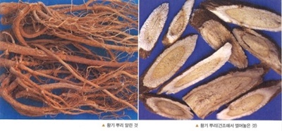 황기는 뿌리를 약재로 사용합니다. 채취와 가공은 가을(10~11월)또는 낙엽이 진 다음, 줄기를 잘라내고 뿌리를 채취하여 세척한 후 양건하거나 온풍건조기를 이용하여 건조하여 사용합니다. 또는 외피를 제거한 다음 말려 꿀을 넣고 약한불에 볶아서 사용합니다. 채취시기는 재배지역에 따라 약간씩 차이가 있습니다.