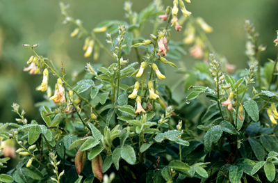 꽃은 7~8월에 노란색으로 피며 잎겨드랑이에 총상꽃차례로 달리는데 시간이 지나면서 붉은 빛이 도는 자주색으로 변하게 됩니다. 꽃부리의 길이는 15~18mm로 나비 모양이고 꽃받침은 5mm로 좀 모양을 띠고 있습니다.